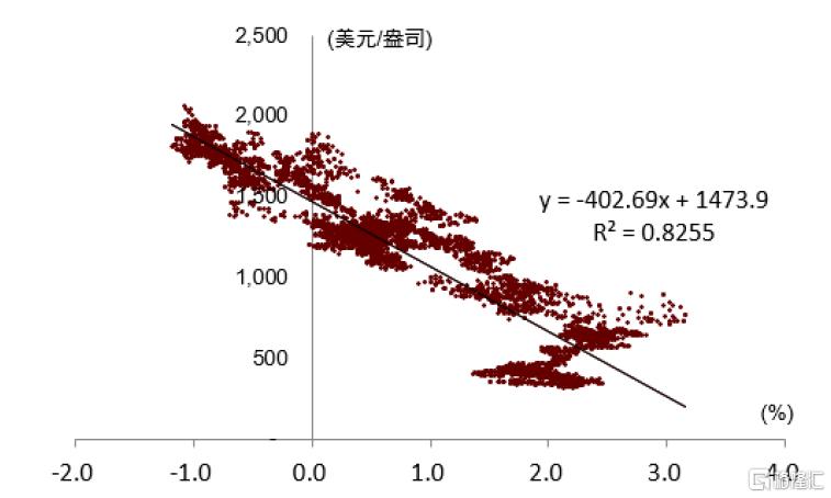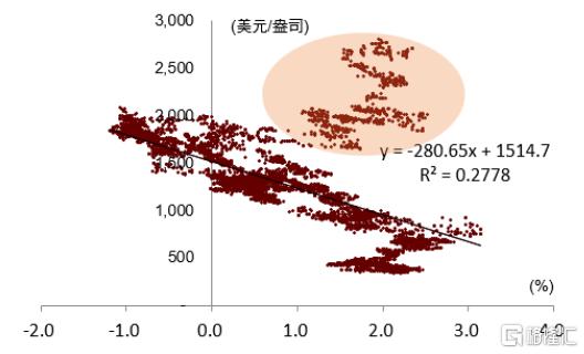 注:本散點圖的樣本時間範圍是2003年初到2022年2月23日俄烏衝突之前。橫軸為美國十年期實際利率,縱軸為倫敦金價。