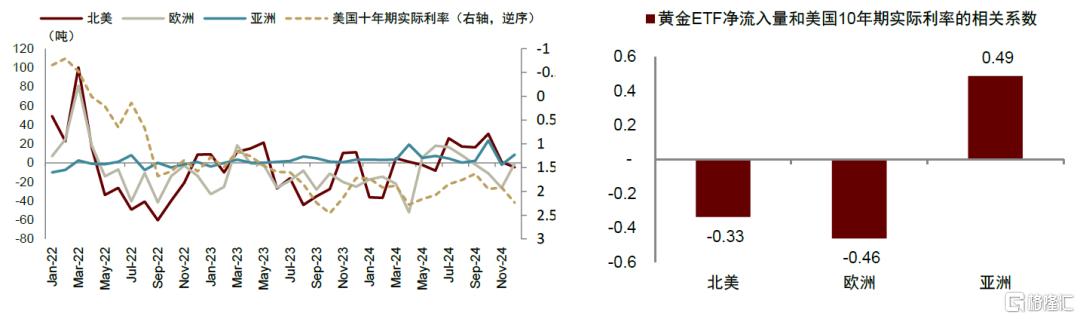 在此背景下,與美國實際利率顯著負相關的歐美黃金ETF購金有望成為支撐金價上行的重要力量。值得關注的是,雖然2022年以來金價與美國實際利率開始顯著脱鈎,但是,北美和歐洲黃金ETF的淨購買量依然和美國實際利率保持較為顯著的負相關關係。我們的測算表明,2022年初至今,北美、歐洲的黃金ETF淨流入量與美國實際利率的負相關係數分別是-0.33和-0.46,而同期亞洲的黃金ETF淨流入則由於去美元的驅動,與美國實際利率的相關係數是+0.49。如果2025年美國實際利率出現一定程度的回落,歐美黃金ETF購金有望支撐金價上行。