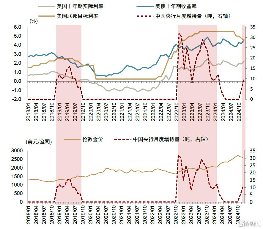 考慮到2024年底以來,美國經濟韌性強於預期,再通脹趨勢顯現,美聯儲的預期管理也逐步轉為鷹派,降息預期顯著下降,美債利率大幅上行至4.8%,我們認為中國央行自去年11月、12月重新加碼增持黃金,有望復刻2019-2022年、2022-2024年的逆周期增持黃金的成功操作,並對強勢美元、美聯儲轉鷹背景下的金價上行提供有力支撐。