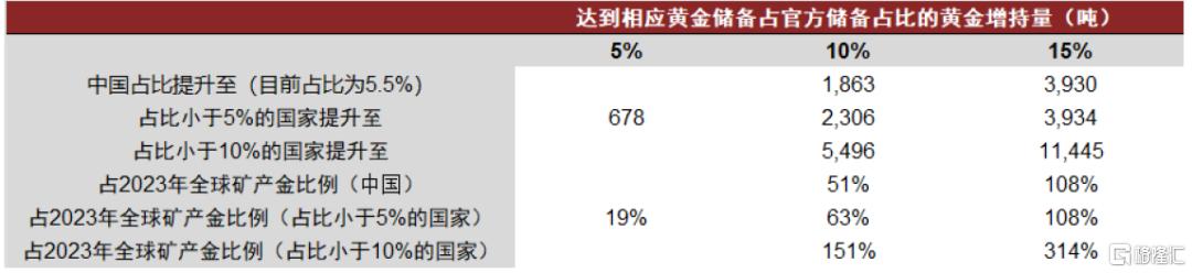 我們的測算表明,如果假定當前黃金儲備佔央行儲備總額的比例低於5%的國家,將該比例提升至5%,需要採購的黃金總量將達到678噸,相當於2023年全球礦產金產量3644噸的19%。如果假定當前黃金儲備佔央行儲備總額的比例低於10%的國家,將該比例提升至10%,需要採購的黃金總量將達到2306噸,是2023年全球礦產金產量的63%。