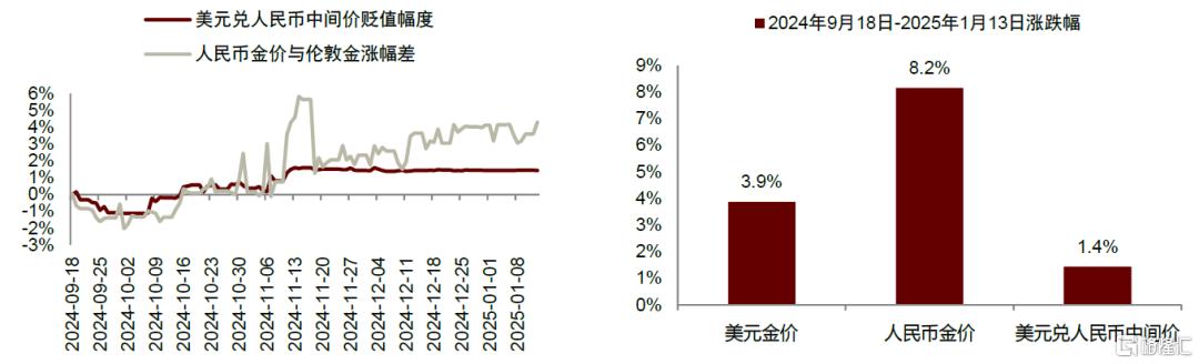 圖表16:2024年9月18日美聯儲降息以來,人民幣金價與美元金價的漲幅差異顯著超越人民幣中間價貶值幅度