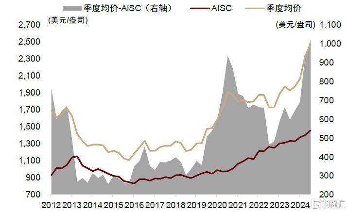 全球範圍看,全球黃金礦企平均單盎司税前利潤在2020-2023年大幅下降,1Q24-3Q24已逐步回升。我們根據世界黃金協會披露的全球黃金公司平均AISC(All in Sustaining Cost)進行測算,3Q20-4Q23,倫敦金季度均價從1909美元/盎司漲至1974美元/盎司,但在全球通脹高企的背景下,AISC成本從976美元/盎司漲至1328美元/盎司,超越了金價漲幅,這導致全球黃金礦業公司季度税前利潤從933美元/盎司降至646美元/盎司,降幅高達31%。