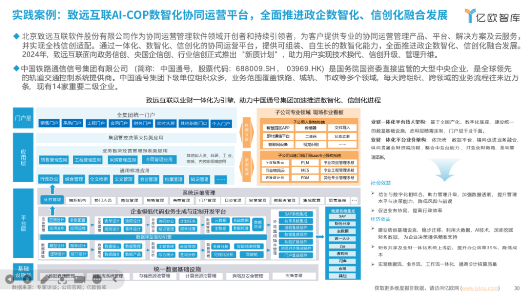 在政策與市場雙驅動下,信創產業蓬勃發展。近日,億歐智庫發佈《2024信創產業新發展趨勢及百強報告》,同時發佈了「2024年度中國精選100強信創廠商」榜單。致遠互聯憑藉深厚的技術及平臺創新底藴和廣泛的客户應用實踐,實力入選「2024年度中國精選100強信創廠商」。同時,攜手客户中國通號集團,共同入選「最佳實踐案例」。