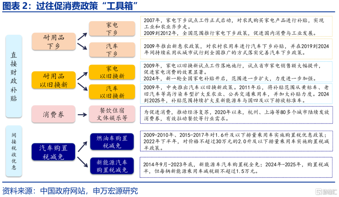 穩增長壓力較大、出口承壓時期,擴內需、促消費通常成為政策重要着力點之一。回顧我國促消費政策「工具箱」,或可分為直接財政補貼,例如下鄉補貼、以舊換新補貼、消費券等,以及間接優惠支持政策,如汽車購置税減免、假期高速公路通行費減免等。