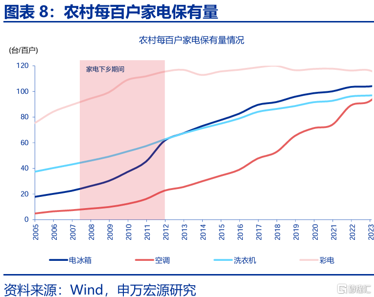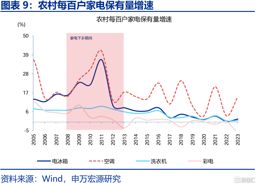 宏觀數據視角,首輪家電及汽車摩托車「下鄉」政策效果顯著。據商務部披露,從2007年試點開始至2012年9月,中央和地方財政累計投入補貼資金765億元,實現銷售額6597.6億元,財政乘數達8.6③。2009-2010年間,首輪家電及汽車摩托車下鄉政策影響下,限額以上家電音像器材類和汽車類商品銷售同比明顯攀升,2009年11月汽車類商品銷售同比攀升至62%,2010年2月家電音像器材類商品銷售同比攀升至53%;全年維度來看,2010年限額以上家電音像器材類和汽車類商品銷售累計同比分別達27.7%、24.8%。從農村家電保有量來看,電冰箱和空調保有量在家電下鄉政策推行期間明顯增長,2011年底分別達61.5台/百户、22.6台/百户,較2006年底年均複合增速分別為22%、25%。
