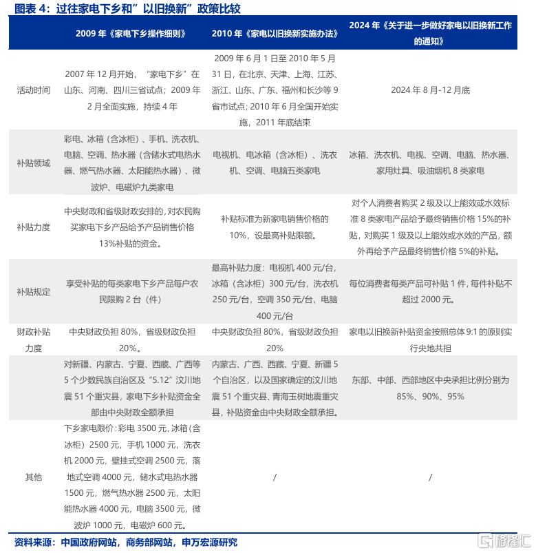 2010年下半年家電以舊換新政策在全國推廣,覆蓋電視、冰箱等5類產品,補貼不超售價的10%,且補貼上限為250-400元/台,中央與省級財政按8:2分擔。②2024年以來的家電以舊換新,包含冰箱、洗衣機、空調等8類產品,並在2025年加入淨水器、洗碗機等家電擴圍至12類產品,本輪補貼比例在15%-20%,補貼上限2000元/台,地方可因地制宜、自主補貼品類,中央與省級財政按9:1分擔。