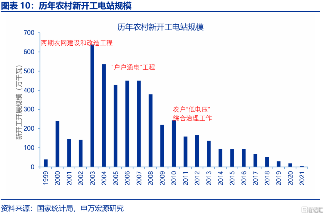 1998年,為應對亞洲金融危機,我國加大對農村基礎設施項目在內的基建項目資金支持力度,連續5年發行長期建設國債支持。1998年到2004年,兩期農網建設和改造工程歷時6年,國家共投入2100多億元,架設低壓電線344萬公里。2006年,建設社會主義新農村背景下,國家電網公司、南方電網公司推行了以大電網延伸為主的「户户通電」和無電户通電工程,截至2008年底,國家電網和南方電網分別解決416萬、16.6萬無電人口的通電問題,為后續家電下鄉政策全國推行奠定電力設施基礎。