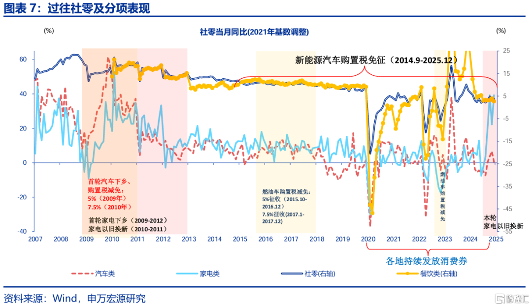 穩增長壓力較大、出口承壓時期,擴內需、促消費通常成為政策重要着力點之一。回顧我國曾使用過的促消費政策「工具箱」,或可分為直接財政補貼,例如下鄉補貼、以舊換新補貼、消費券等,和間接優惠支持政策,典型如汽車購置税減免、假期高速公路通行費減免等。2007-2012年期間,我國曾推行家電和汽車摩托車下鄉和以舊換新等政策;2014-2017年和2022年下半年,政策通過部分汽車購置税優惠政策,促進燃油車消費,而2018年以來新能源汽車購置税減免政策持續也推動我國新能源汽車產業快速發展。