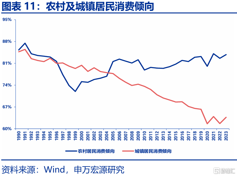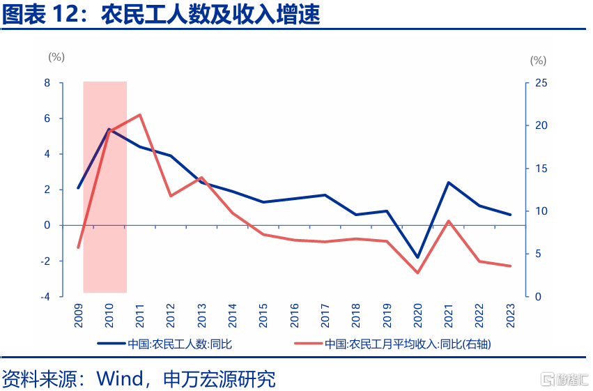 2005年12月29日,第十屆全國人大常委會第十九次會議決定,2006年1月1日起廢止農業税條例。農村税費改革有效降農民負擔,據統計,2006年全面取消農業稅后,與改革前的1999年相比,全國農民一年減輕負擔約1250億元,人均減負約140元。④「減負」之外,2008年底開啟的「四萬億」穩增長計劃亦為農民工羣體帶來「增收」,2009-2011年期間農民工人數、農民工人均收入增速大幅提升,進一步從收入端提升農村居民消費能力。