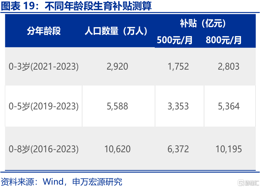 從中長期來看,改善收入分配機制、加強社會保障等機制性政策或在中長期發揮更大作用。根據當前養老金領取人員測算,若適當提高退休人員基本養老金,假設每位退休人員每月收入增加500元,則全年城鎮職工基本養老保險或多支出8700多億元;適當提高城鄉居民基礎養老金,假設每月增加200元,則全年城鄉居民養老保險或多支出約4200億元;育兒補貼方面,靜態視角來看,若對0-5歲幼兒每月補貼800元,全年財政或需多支出近5400億元。