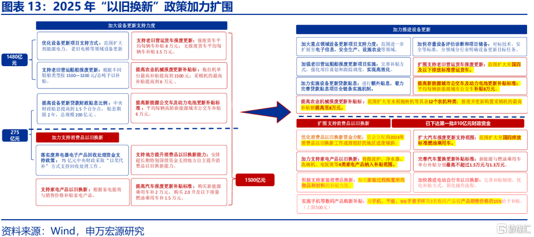 本輪「以舊換新」效果明顯,或主因補貼力度創新高、比例和範圍擴大。與2020年以來的促消費政策相比,本輪消費品「以舊換新」效果亮眼,限額以上家電類商品銷售規模自2024年9月「以舊換新」政策落地后明顯提速,12月當月同比達39%。本輪「以舊換新」政策效果明顯或緣於本輪財政資金補貼規模較高,補貼範圍擴大、補貼比例和補貼上限均有提升;同時,中央財力支持加大、平均達9成。本輪財政補貼加碼帶來的耐用品消費提速,或一定程度緣於補貼政策推動居民將未來耐用品需求前置。因此出於延續「以舊換新」政策效果,2025年初財政補貼政策前置發力,第一批810億元財政資金已經下達;補貼家電領域也進一步擴圍、資金下達流程簡化以提高資金使用效率。
