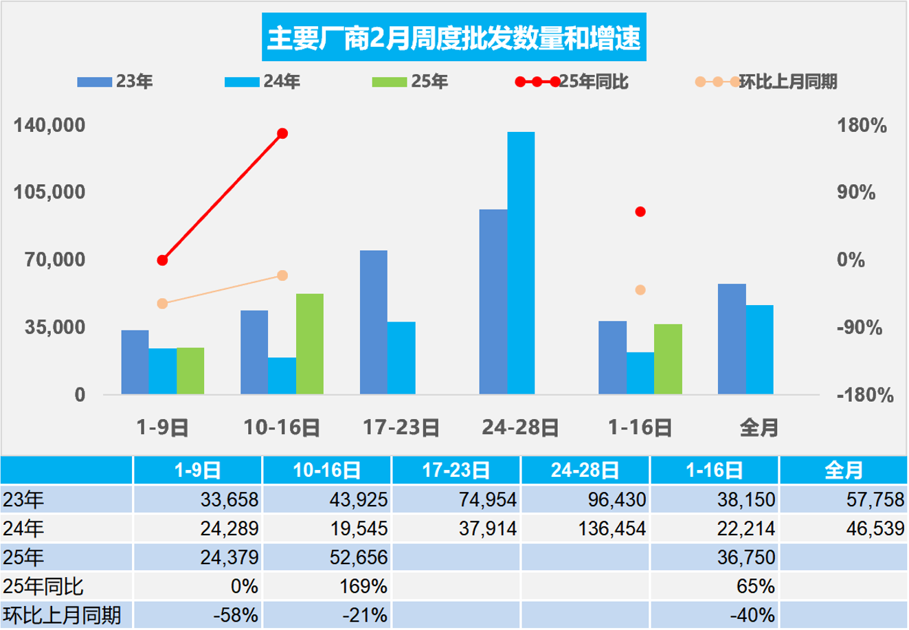 2月1-16日,全國乘用車廠商批發58.8萬輛,同比去年2月同期增長65%,較上月同期下降40%;今年以來累計批發268.9萬輛,同比增長9%。