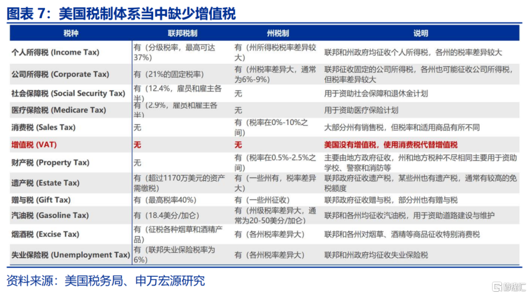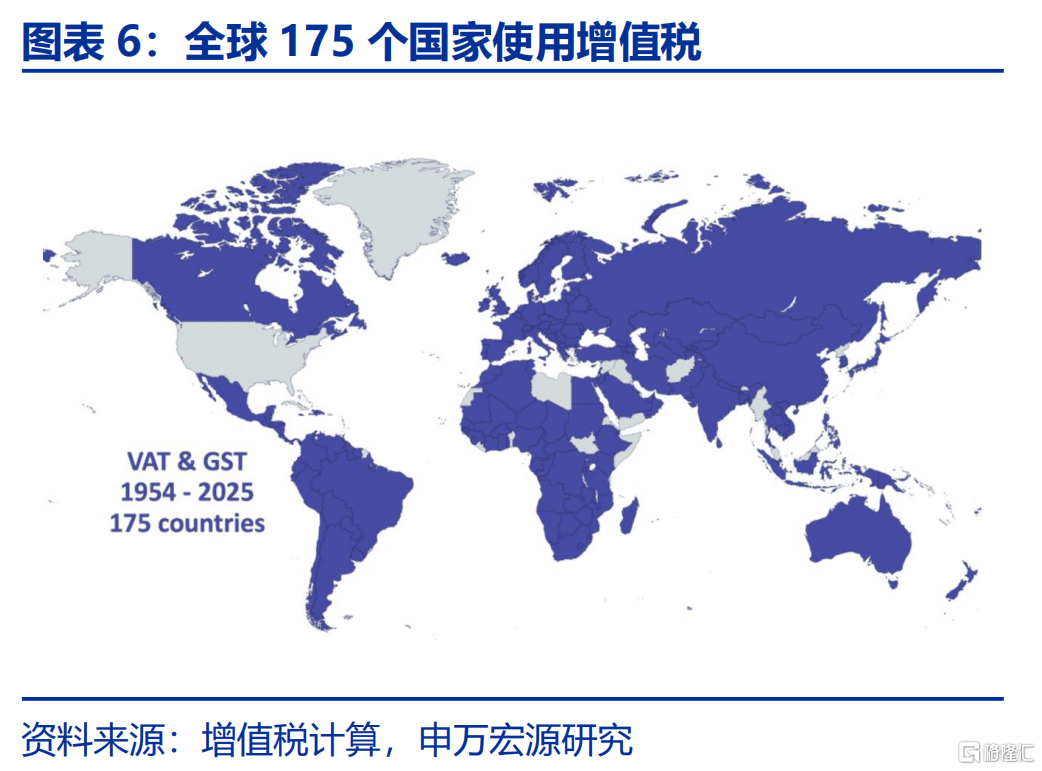 由於缺少增值税的配合,美國難以直接實現財政貶值,現有稅制體系在全球貿易中處於競爭劣勢。增值税的設計有助於發展製造業,2025年,全球共175個國家使用增值税,美國是少數實行銷售税的國家之一。由於貨幣政策受約束,通過財税手段實現模擬貶值或是其目的之一。