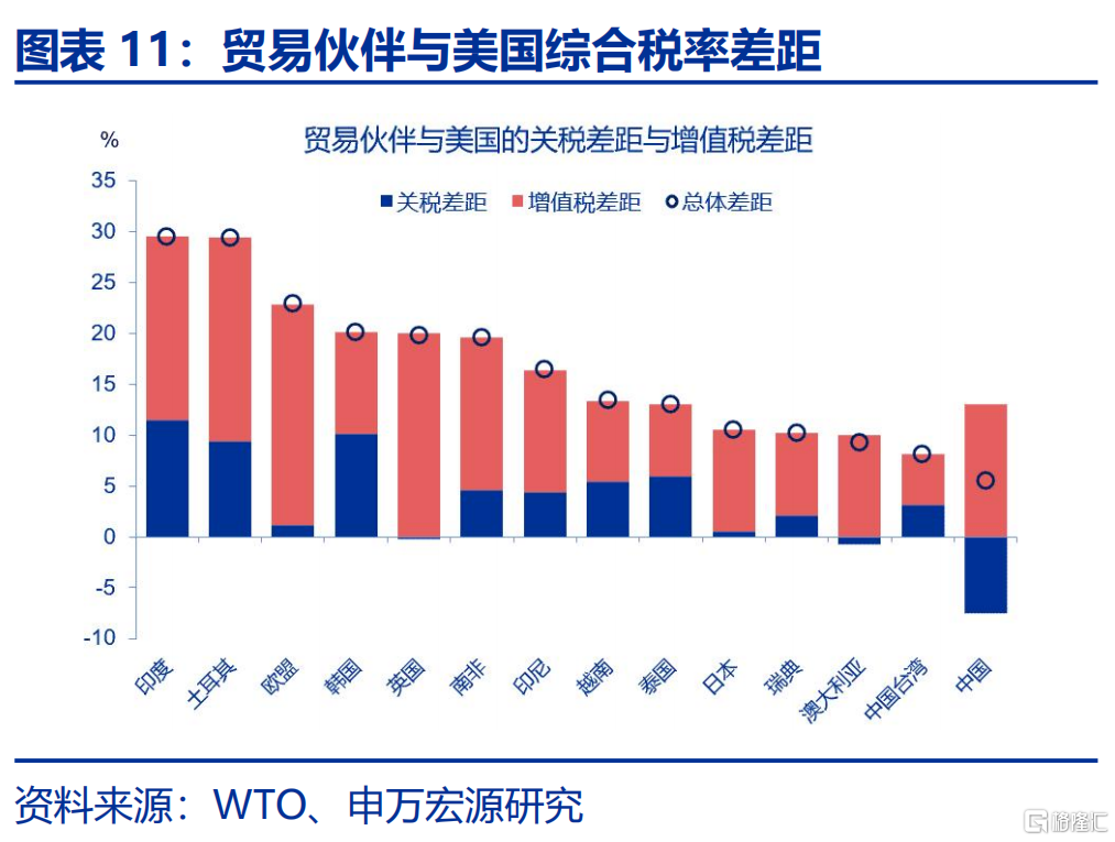 對等關税由於面向美國所有貿易伙伴,具有普遍性,帶來的關税收入可直接決定財政貶值能否成功,關税可談判性可能低於外界預期。從歐洲的經驗來看,財政貶值能否成功實施,取決於能否保持赤字中性,避免赤字大幅擴張,否則可能引發通脹問題。由於特朗普的減税規模或達到4.5萬億美元的量級,僅依賴加、墨及對華關税僅有1110美元的關税收入,或倒逼美國對盟友的關税力度上升。僅從關税税率看,2022年,印度與美國之間的關税税率差為11.5%,其次是韓國10.1%,土耳其9.4%。考慮增值稅后,歐盟整體增值税與美國的差距為21.7%,英國20%,印度18%,日本10%。綜合增值税和關稅后,對等關税主要受影響的國家為印度、土耳其、歐盟、韓國、英國等,美國盟友雖佔多數,但站在美國整體的税收戰略來看,對盟友關税的可談判性可能低於外界預期。