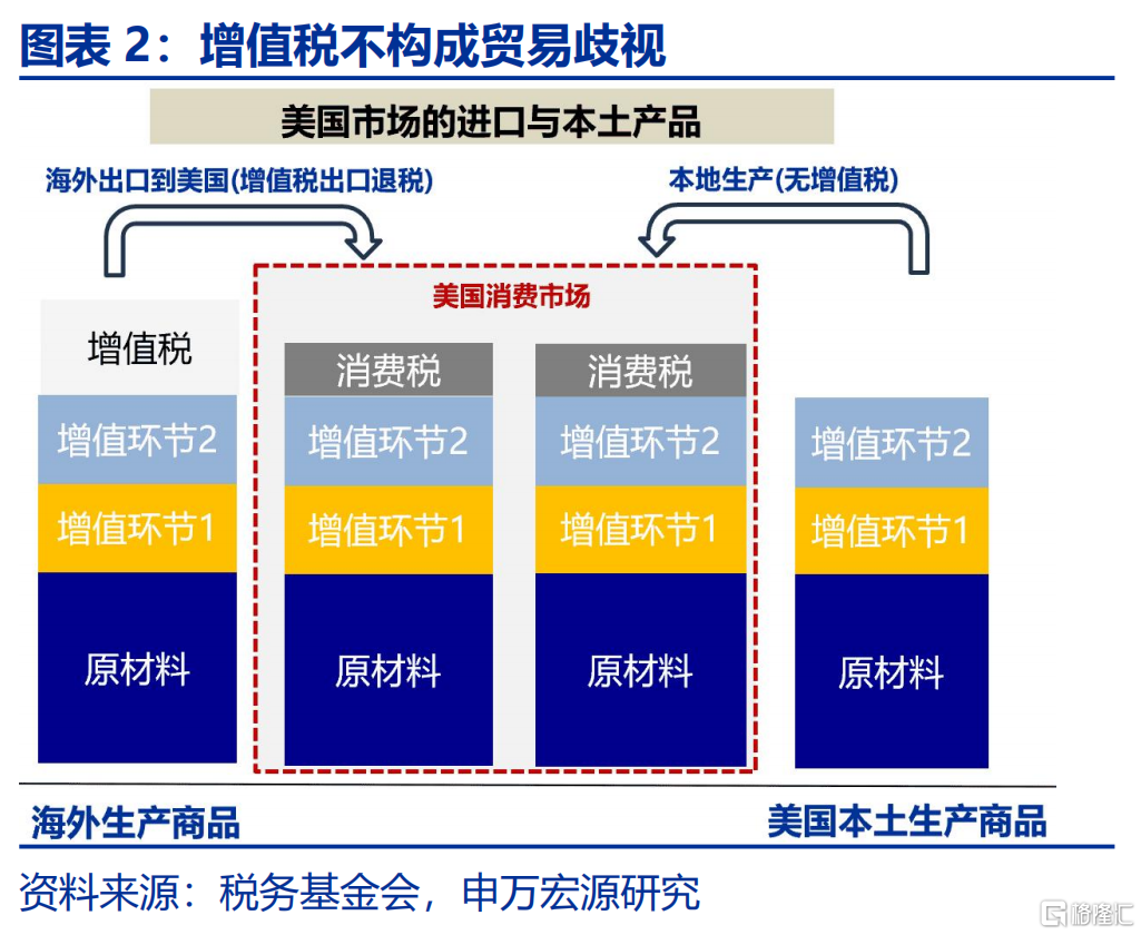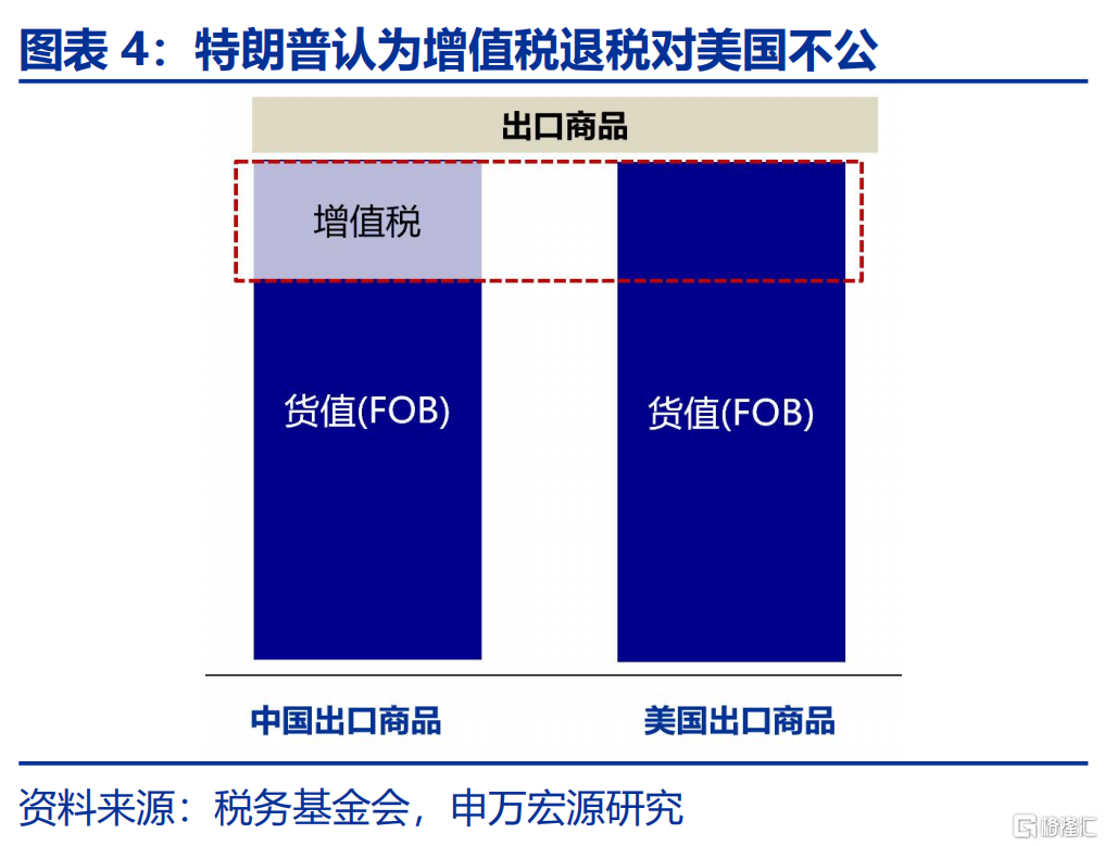 從單個稅種看,增值税具有貿易中性,並不構成貿易壁壘的核心理由。增值税對進口商品徵稅,對出口商品實行退税,是國際貿易中的通行做法。但特朗普認為,增值税調節了商品價格,對美國商品在國際市場上造成了不利影響。這種判斷實質上是着眼於整個稅制體系的競爭。