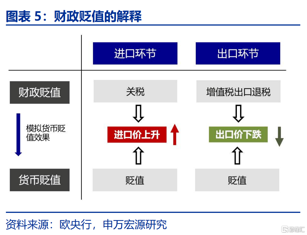 從整個稅制體系看,關税搭配增值税,能夠在不調整匯率的情形下,模擬貨幣貶值的效果,即財政貶值(Fiscal Devaluation)。進口環節關税,可抬高進口價;出口環節,增值税出口退税,可降低出口價,二者結合相當於貨幣貶值的效果。優勢是可繞過貨幣當局,達成實際匯率貶值。