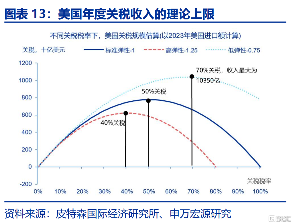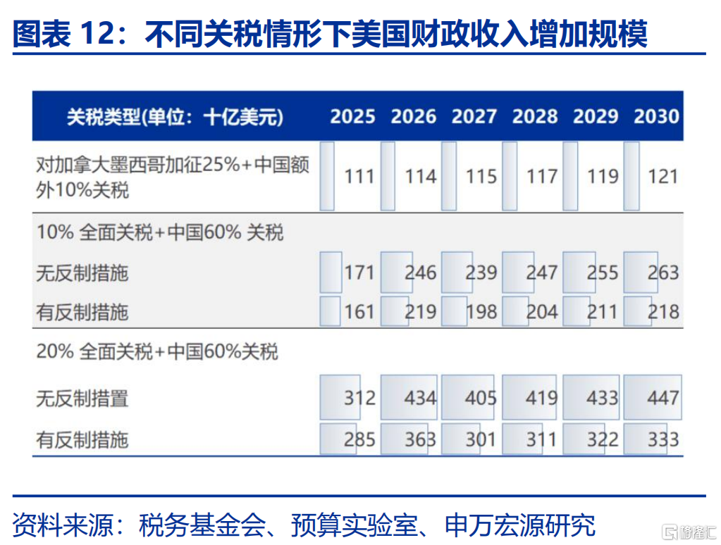 對等關税主要起兩方面作用。一是針對性抬升進口品價格,美國與他國的關税税率差距主要由個別重點產品貢獻。二是通過關税收入維持赤字中性,對加、墨及中國關税難以彌補赤字缺口,或倒逼美國增加對等關税力度,對歐洲、英國等盟友的對等關税可談判性或低於市場預期。