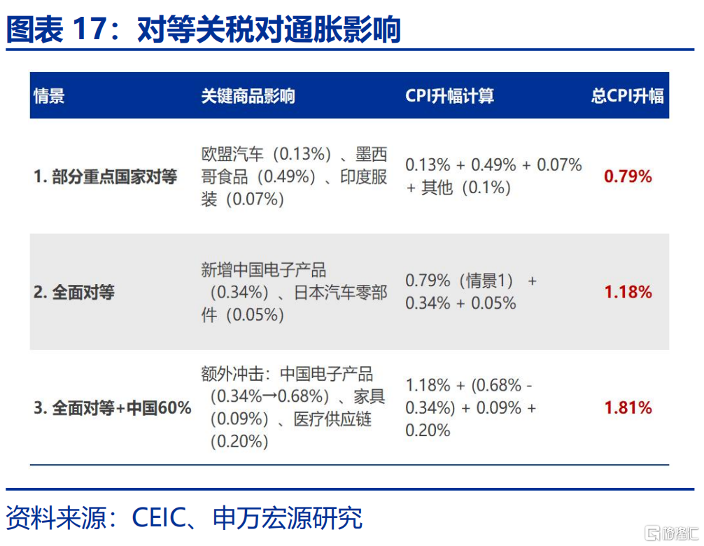 對等關税若實施,或導致美國通脹抬升0.8到1.8個百分點。依據前文的情形劃分,基於CPI權重及進口商品權重計算,情形一,美國對重點國家實行關税對等,可能導致美國CPI通脹上升0.8個百分點;情形二,全面關税對等的條件下,可能導致美國CPI通脹提高1.2個點;情形三,在全面對等的基礎上,對中國加徵60%關税,可能導致美國通脹上升至1.8個點。