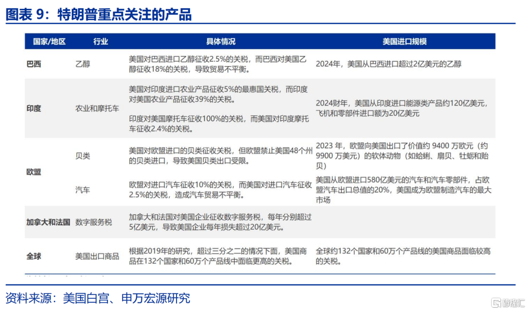 在三步走戰略實施的過程中,對等關税可針對性抬升進口商品價格。美國與他國的關税税率差距並非體現在所有產品,而是主要由個別產品貢獻。韓國關税比美國高10.1%,對美國進口的農產品徵收高達500%的關税;巴西的平均農業關税為14%,美國為5%,影響了價值80億美元的美國出口產品;在汽車進口方面,歐盟對進口汽車徵收10%的關税,而美國對進口汽車徵收2.5%的關税。