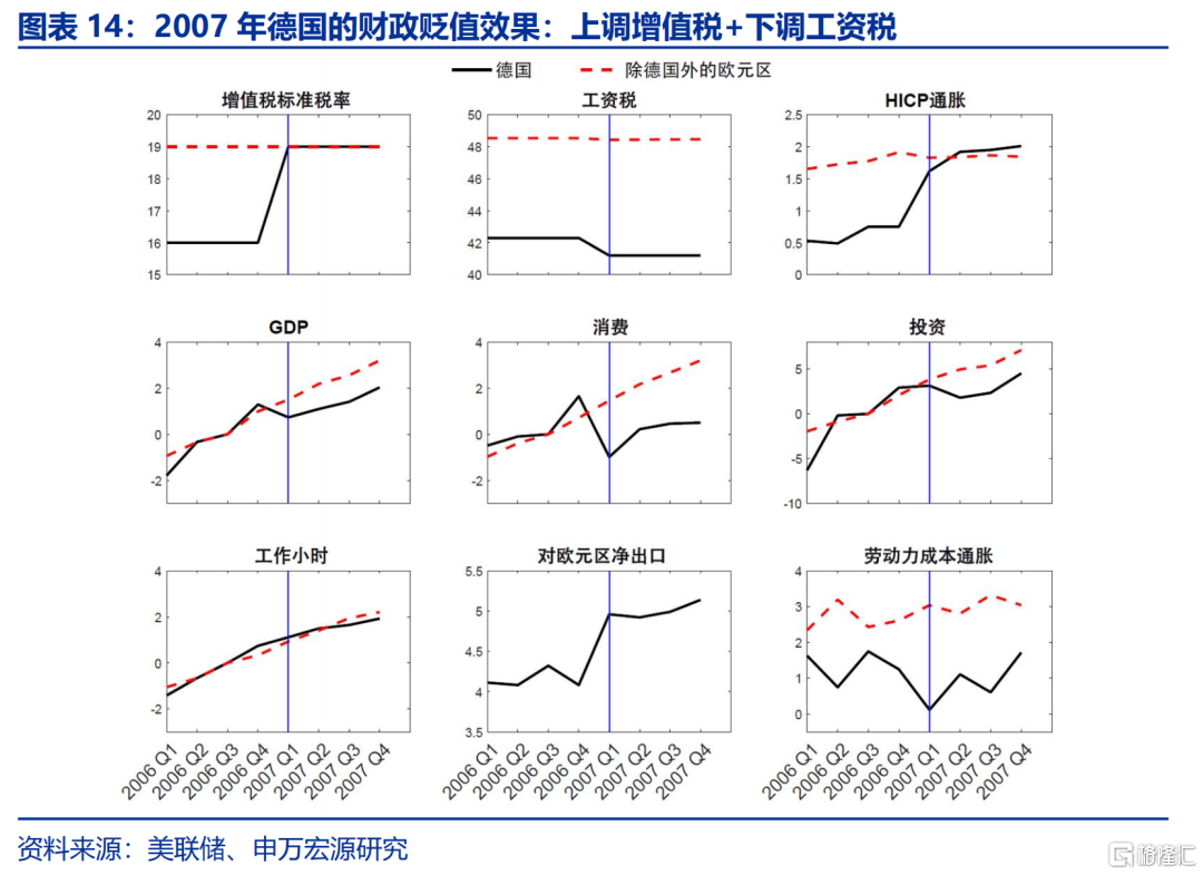 財政貶值尤其適用於歐元區等匯率政策受限制的國家。歐元區作為貨幣聯盟,各國不能依賴貨幣貶值改善貿易平衡。歷史上,歐元區國家為提高出口競爭力,主要手段是財政貶值:提高增值税的同時,降低個人所得稅或社保繳費率。2007年,德國將增值税從16%提高到19%,並將企業的社保繳費率從6.5%削減到4.2%,出口得到擴大。2012年,西班牙減少企業社保繳費,提高了增值税,使得實際有效匯率貶值0.7%,出口增長了2%,GDP增加了約1%。
