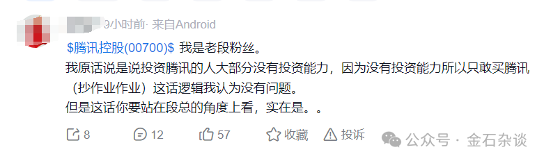 刪帖之后,原博當事人澄清:我是老段粉絲。我原話説是説投資騰訊的人大部分沒有投資能力,因為沒有投資能力所以只敢買騰訊(抄作業)。這話邏輯我認為沒有問題。但是這話你要站在段總的角度上看,實在是。。