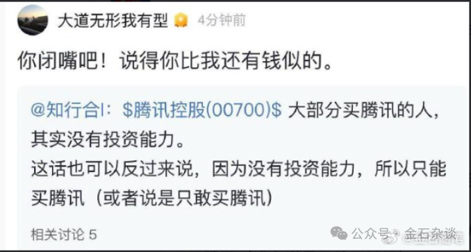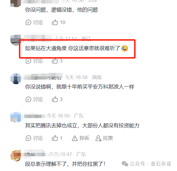 但是如果站在經常看好蘋果、拼多多、茅臺、騰訊的段永平來説,這話就無法接受了:我賺那麼多錢,是沒投資能力?有球友也表示:如果站在大道角度,你這話意思就很難聽了。