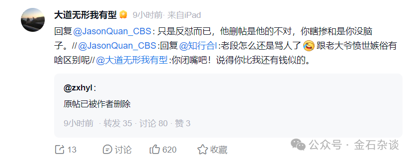 后來該球友刪帖,有粉絲問大道為何罵人?段永平還不忘挖苦一下:只是反懟而已,他刪帖是他不對,你瞎摻和是你沒腦子。