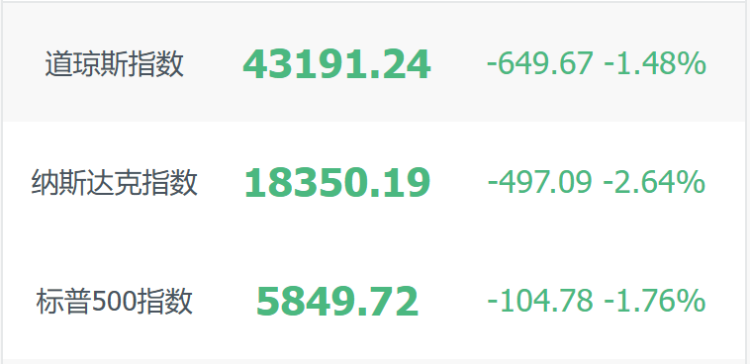 特朗普稱對墨加商品加徵25%關税將於4日生效,美股三大指數集體收跌,道指跌1.48%,納指跌2.64%,標普500指數跌1.76%,恐慌指數VIX飆漲20%。大型科技股普跌,英偉達跌超8%,博通跌超6%,亞馬遜跌超3%,特斯拉、谷歌、微軟跌超2%。