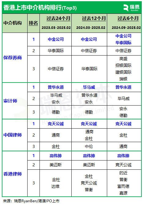就過去12個月排名前十位的保薦人分別是: 1. 中金公司,以 19家排在第一位,保薦參與率 25.3%; 2. 中信證券,以 12家排在第二位,保薦參與率 16.0%; 3. 華泰國際,以 9家排在第三位,保薦參與率 12.0%; 4. 海通國際、招銀國際、建銀國際,各以 6家並列排在第四位,保薦參與率 8.0%; 5. 中信建投、高盛、瑞銀、農銀國際,各以 4家並列排在第七位,保薦參與率 5.3%; 6. 摩根大通、國泰君安,各以 3家並列排在第九位,保薦參與率 4.0%。