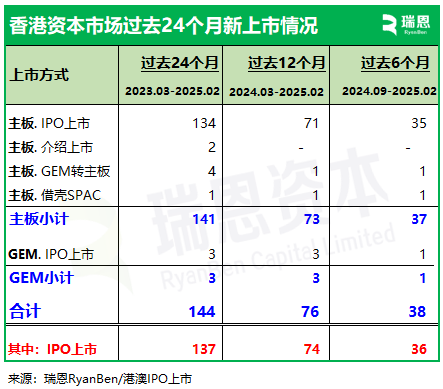 根據統計, 在過去的24個月(2023年3月至2025年2月)香港新上市公司 144家,主板上市141家(包括:134家IPO上市、2家介紹上市、1家借殼SPAC、4家GEM轉主板),GEM(創業板)上市 3家; 在過去的12個月(2024年3月至2025年2月)香港新上市公司 76家,主板上市73家(包括:71家IPO上市、1家借殼SPAC、1家GEM轉主板),GEM(創業板)上市3家; 在過去的6個月(2024年9月至2025年2月)香港新上市公司 38家,主板上市37家(包括:35家IPO上市、1家借殼SPAC、1家GEM轉主板),GEM(創業板)上市1家。