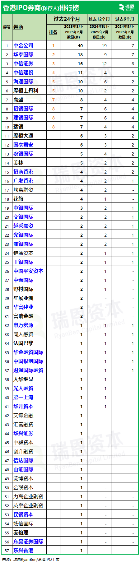 智通財經APP獲悉,近日,瑞恩資本公佈香港上市中介機構排行榜,2023年3月至2025年2月,中金、普華永道、競天公誠、高偉紳,繼續領先。就過去24個月保薦的新上市項目的數量來看,排在前三位的保薦人券商分別是:1.中金公司,以40家排在第一位,保薦參與率 28.0%;2. 華泰國際,以18家排在第二位,保薦參與率 12.6%;3.中信證券,以16家排在第三位,保薦參與率 11.2%。
