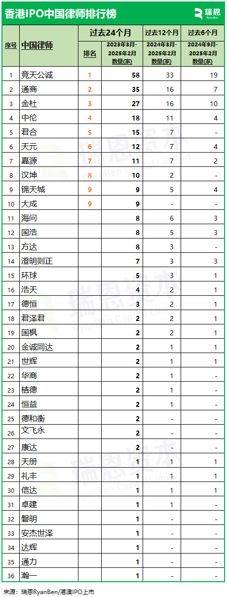 (三) 過去6個月的數據 (2024年9月至2025年2月) 就過去6個月的數據來看,這36間中國律師中的20間,參與35家(涉及到中國業務或資產)新上市。