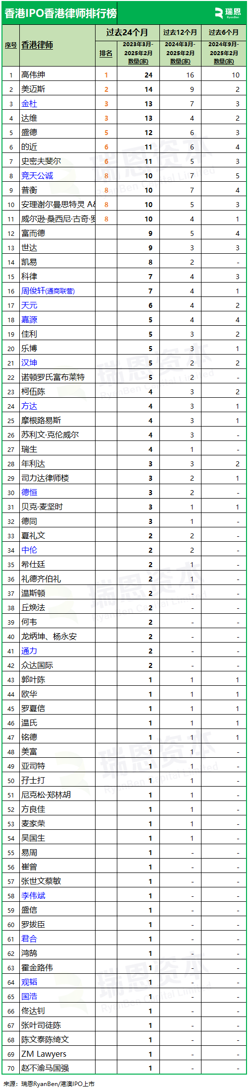 (二) 過去12個月的數據 (2024年3月至2025年2月) 就過去12個月的數據來看,這36間中國律師中的27間,參與71家(涉及到中國業務或資產)新上市。