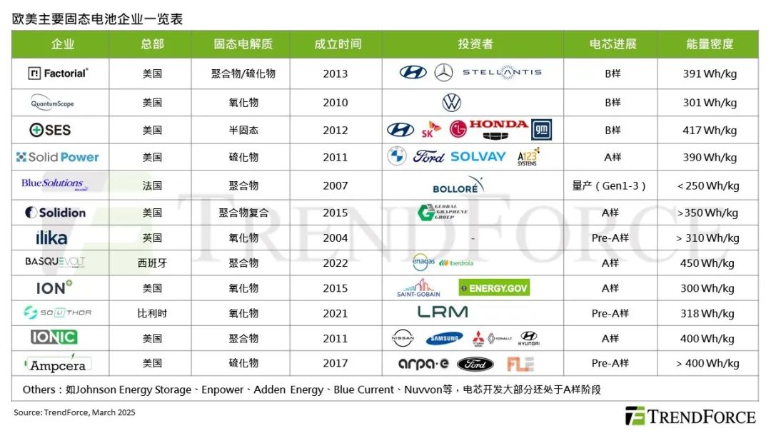 據TrendForce集邦諮詢統計,截止2024年底,QS、Solid Power、SES、Factorial Energy、Adden Energy、Basquevolt等17家歐美固態電池企業融資總額已突破42億美元。近年在美國能源部(DOE)、歐盟Horizon Europe等電池相關項目計劃資助下,推進歐美固態電池技術研發進展,部分廠商已將研發成果擴大到中試規模,並與整車廠商合作進行裝車測試。如美國的Factorial Energy已交付樣品給Stellantis(斯特蘭蒂斯)和Mercedes-Benz(梅賽德斯-奔馳)等客户,進行原型車輛道路測試。