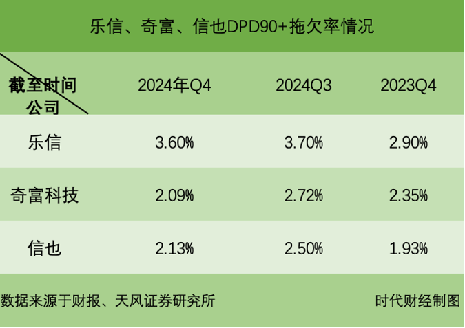 從環比數據來看,樂信、奇富科技、信也科技的資產質量都出現邊際改善的趨勢。如下圖所示,和2024年3季度末對比來看,3家公司的貸款總額的DPD90+拖欠率(逾期率)在2024年4季度末均出現了回落。