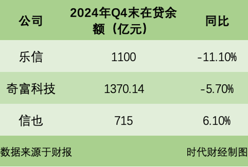 在貸余額方面,奇富科技和樂信均出現規模收縮。截至2024年末,奇富科技在貸余額為1370億元,較上一年同比下降5.7%;樂信在貸余額為1100億元,同比降幅超過11%。而信也科技則是特例,其2024年末在貸余額達715億元,較上一年的674億元上漲6.1%。