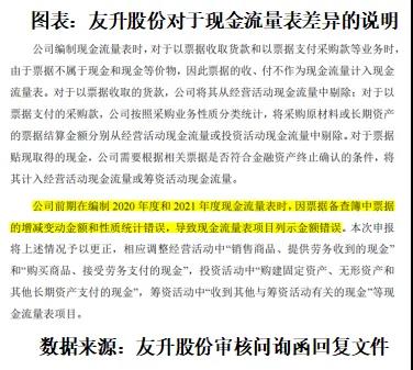 对此,友升股份在审核问询函回复文件中解释称,上述情形主要因其公司票据备查簿中票据增减变动金额和性质统计错误,导致现金流量表项目列示金额错误。