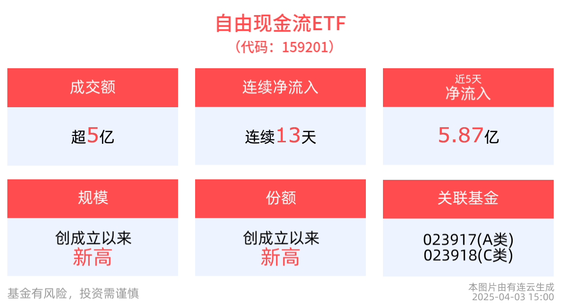從資金淨流入方面來看,自由現金流ETF近13天獲得連續資金淨流入,最高單日獲得2.34億元淨流入,合計「吸金」14.96億元,日均淨流入達1.15億元;份額方面,自由現金流ETF最新份額達29.59億份,創成立以來新高;規模方面,自由現金流ETF最新規模達29.71億元,創成立以來新高。