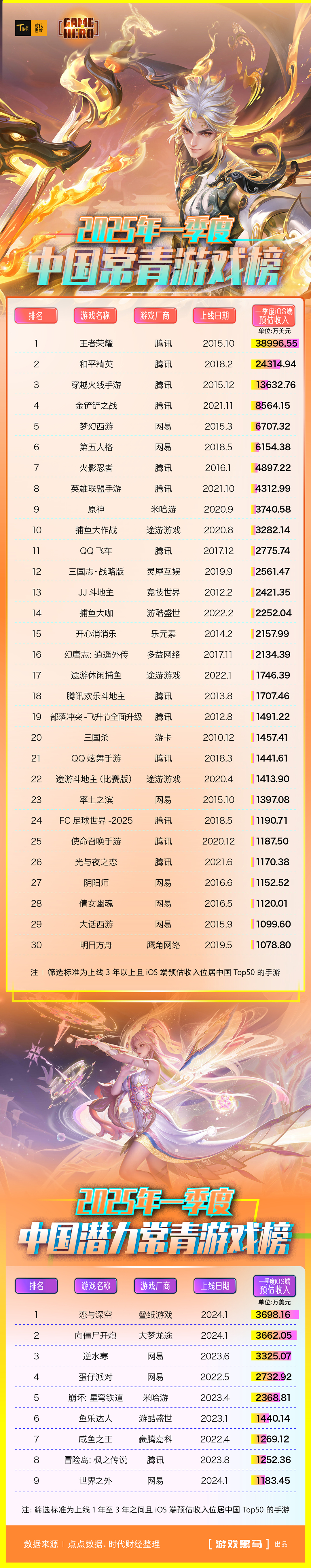 时代财经以上线3年以上且iOS端预估收入跻身中国地区Top50为筛选标准,统计并发布《2025年一季度中国常青游戏榜》(下称《常青榜》);同时以上线1年至3年且iOS端预估收入跻身中国地区Top 50为标准,统计并发布《2025年一季度中国潜力常青游戏榜》(下称《潜力常青榜》)。