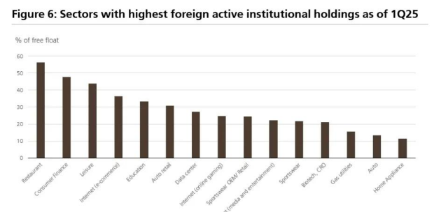 圖 6:截至 2025 年第一季度外國活躍機構持倉最高的行業