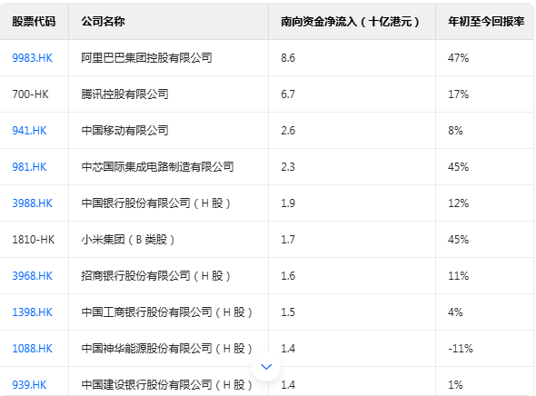 截至季度末,這一趨勢基本保持不變,南向投資者還大幅增持了醫療保健行業。年初至今,淨買入最多的股票是阿里巴巴、騰訊和中國移動。