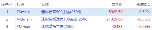 美股周三盤前,三大指數期貨小幅下挫,納指期貨 $NQmain 跌0.55%,標普期貨 $ESmain 跌0.55%,道指期貨 $YMmain 跌0.68%