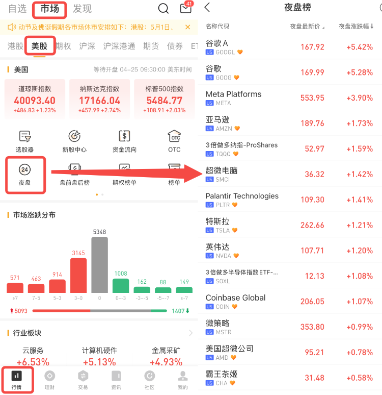 華盛通APP-行情-市場-美股-點擊夜盤,即可查看目前支持夜盤交易的標的。華盛支持的夜盤標的範圍將持續擴展。