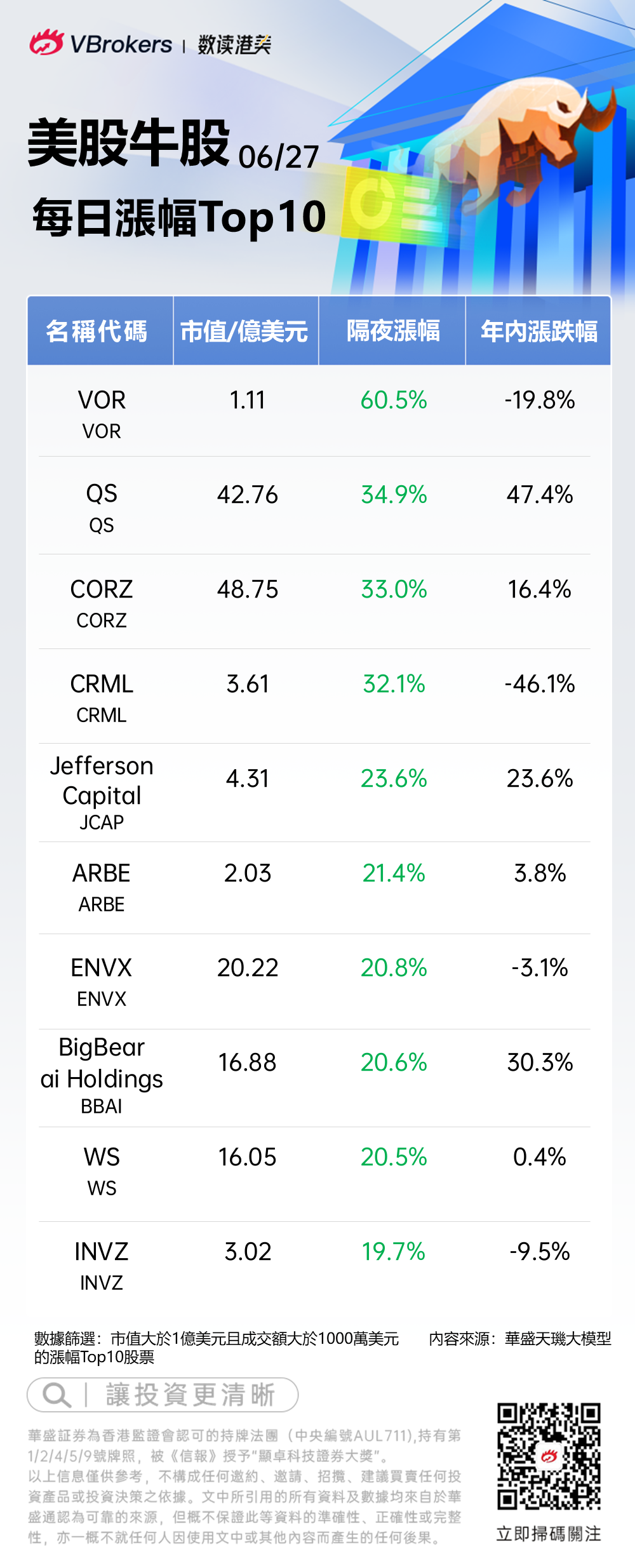 發仔梳理了每日美股漲幅Top10榜單,供投資者參考。以下為隔夜美股漲幅靠前的個股:
