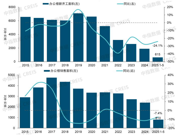 辦公樓投資銷售降幅明顯收窄,但開工降幅同樣較大。從投資開工來看,2025年1-5月,全國辦公樓開發投資額為1412億元,同比下降16.3%,降幅較2024年末擴大7.3個百分點。新開工面積為615萬平方米,同比下降24.1%,降幅較2024年末收窄3.6個百分點。從銷售來看,2025年1-5月全國辦公樓銷售面積為810萬平方米,同比下降7.4%,降幅較2024年末收窄4.1個百分點。