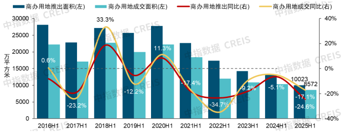 圖:2016年上半年-2025年上半年全國300城純商辦用地推出及成交面積走勢