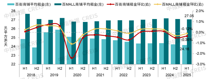 根據對全國重點城市主要商業街和典型購物中心商鋪租賃樣本的調查數據,2025上半年,由全國重點城市100條商業街商鋪為樣本標的構成的百大商業街(百街)商鋪平均租金為24.16元/平方米/天,環比下跌0.35%,跌幅較2024下半年收窄0.16個百分點;由100個典型購物中心商鋪為樣本標的構成的百大購物中心(百MALL)商鋪平均租金為27.05元/平方米/天,環比下跌0.12%,跌幅較2024下半年收窄0.19個百分點。