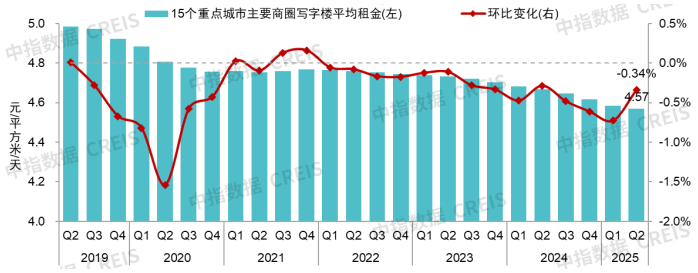 圖:2019-2025年全國重點城市主要商圈寫字樓平均租金及環比變化