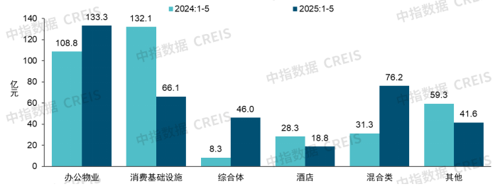 分物業類型來看,優質零售商業及辦公物業仍最受青睞。從交易宗數來看,2025年1-5月,以商業地產(商業、辦公樓、酒店、綜合體)為標的的交易宗數共51宗,佔比61%。以披露金額的交易計算,零售商業交易金額相對較高,為555億元,佔比60%,辦公樓交易金額為235億元,佔比25%,綜合體、酒店交易金額合計約30億元,合計佔比3%,工業類標的、租賃住房及產業園區交易金額合計約112億元,合計佔比12%。