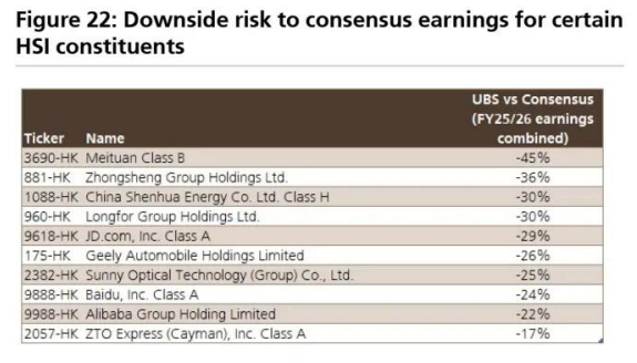 1)瑞銀分析師的預測顯示,恆生中國企業指數的共識盈利可能有 4% 的下行空間(尤其受外賣行業競爭影響);